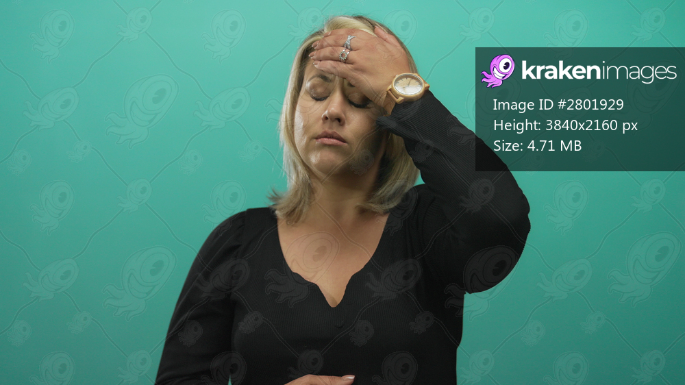 Woman wearing black top touches forehead for headache against teal studio wall with closed eyes; stress fatigue.
