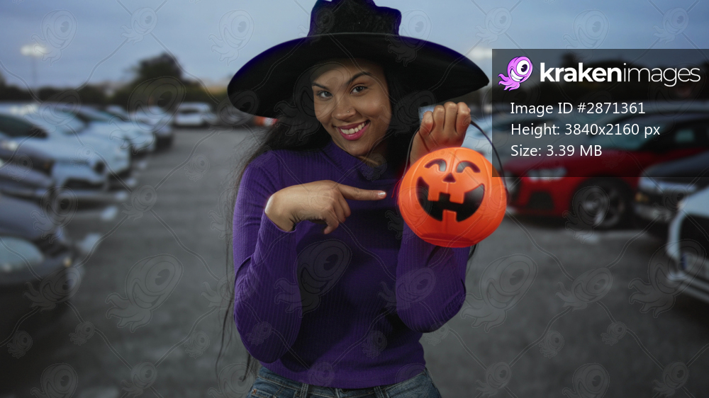 Woman wearing black witch hat finger pointing with playful smile to orange pumpkin bucket on street; spooky fun.