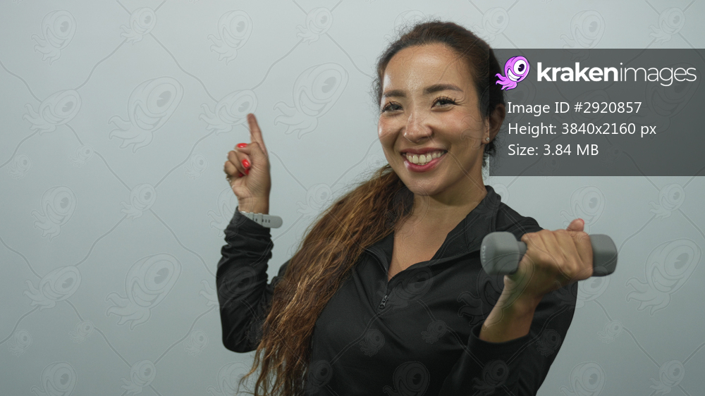 Woman wearing black workout top holding dumbbell and points finger in studio by pale gray wall; confidence fitness health.