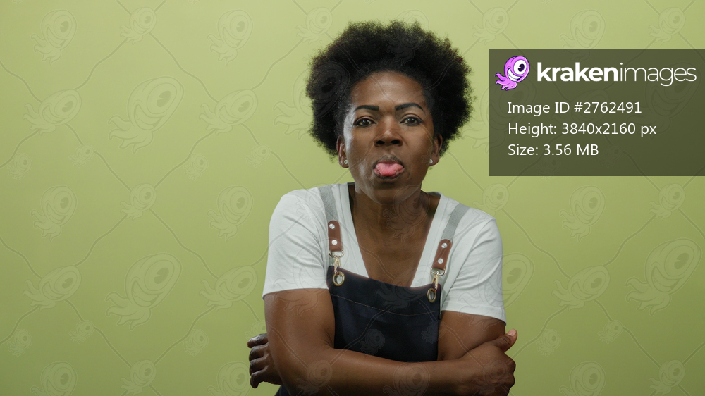 Woman wearing blue apron making diverse expressions on yellow background, conveying playful energy with her gestures and facial expressions, emphasizing creativity. - Kraken Images