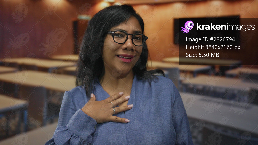 Woman wearing blue blouse and glasses with hand on chest among rows of wooden desks in classroom; doubt.