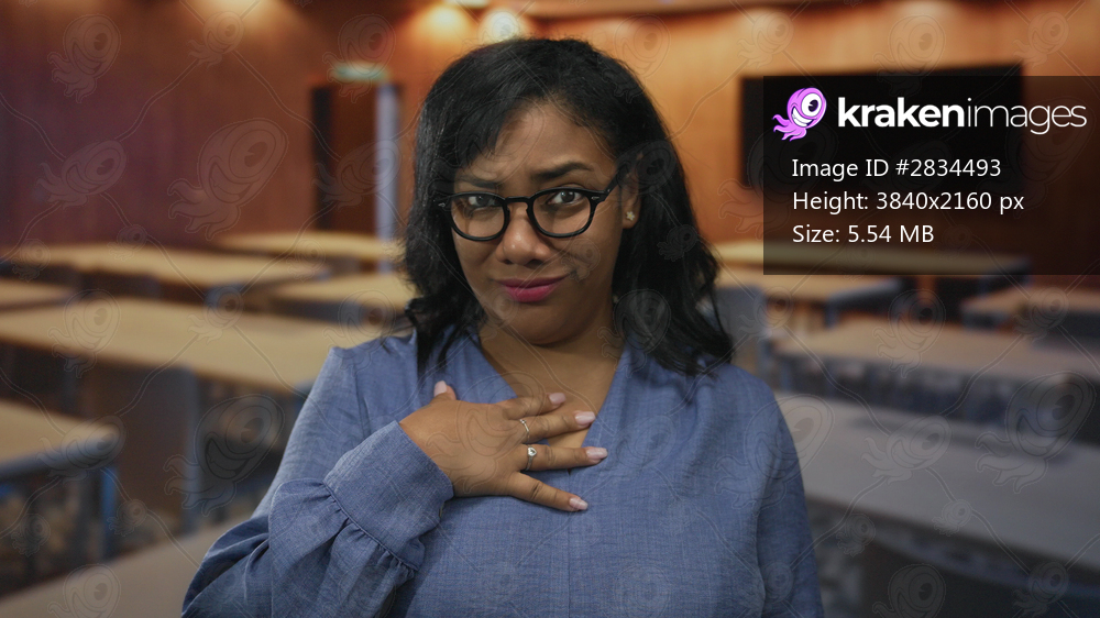 Woman wearing blue blouse and glasses with hand on chest among rows of wooden desks in classroom; doubt.