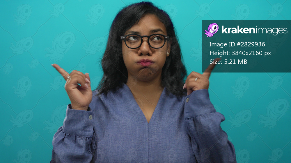 Woman wearing blue blouse with glasses puffing cheeks and pointing fingers sideways against a teal studio wall; hesitation.