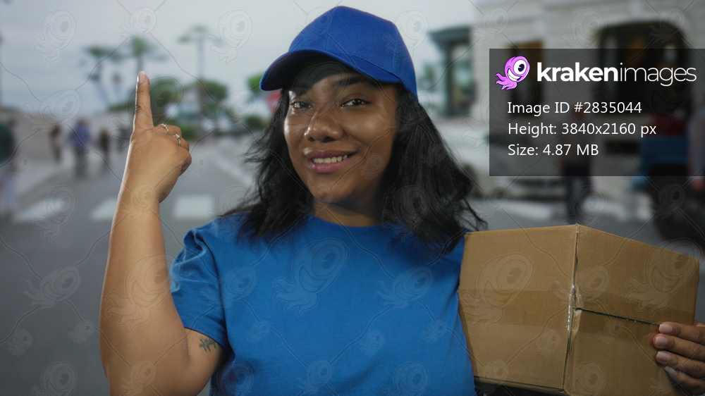 Woman wearing blue cap and shirt holding cardboard box points finger upward amid blurred traffic on street in city; confidence optimism.