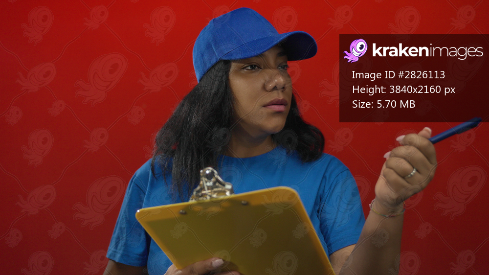 Woman wearing blue cap and shirt holds yellow clipboard and blue pen in studio; focus planning duty.