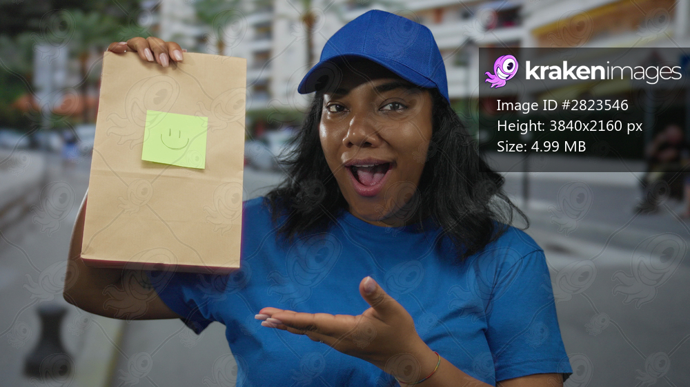 Woman wearing blue cap and smiling face holding brown paper bag with pointing hand on street; delivery joy.