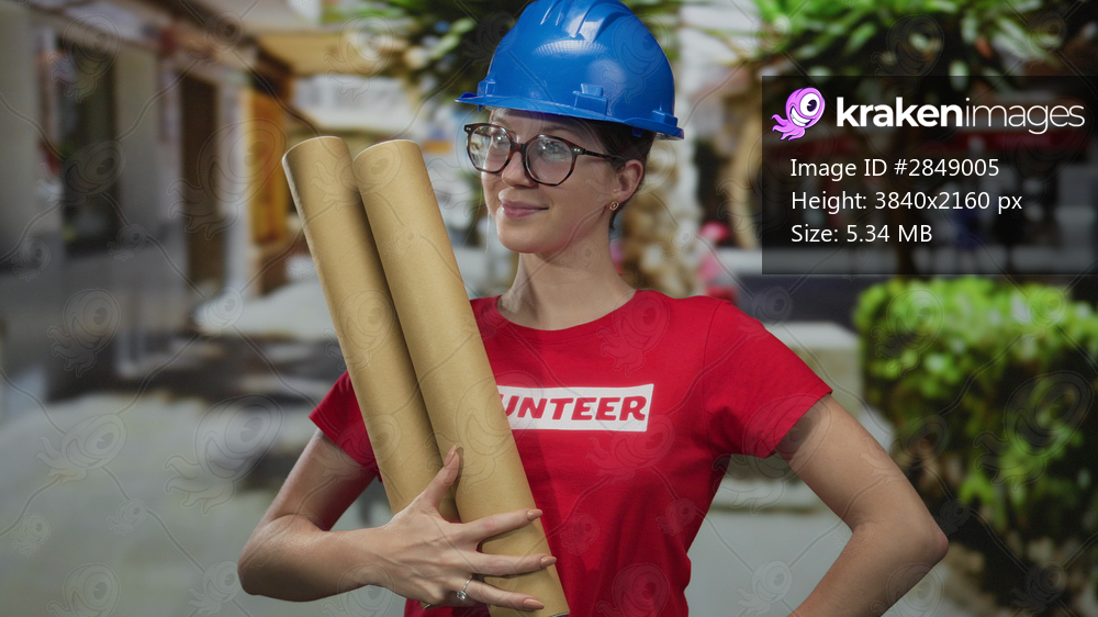 Woman wearing blue hardhat and red volunteer shirt holding tube on sunlit street with city buildings and palm trees; confidence.