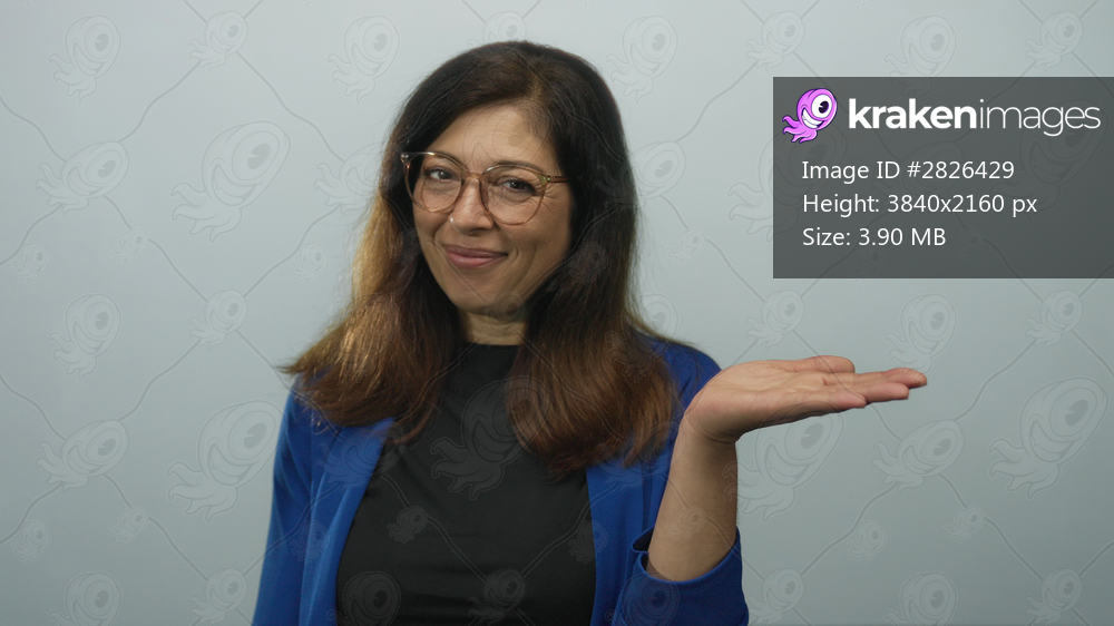 Woman wearing blue jacket smiling and finger pointing to open palm in studio with light blue background; warm friendly invitation.