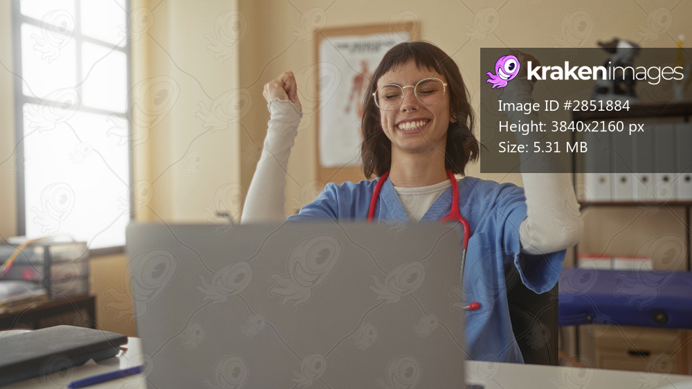 Woman wearing blue scrub top and stethoscope clapping hands over laptop at desk in a clinic building with anatomical chart behind; pride success.