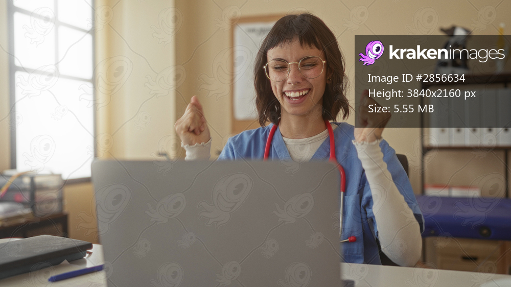 Woman wearing blue scrub top and stethoscope clapping hands over laptop at desk in a clinic building with anatomical chart behind; pride success.