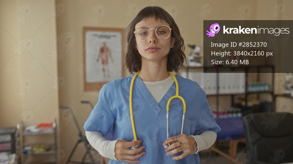 Woman wearing blue scrubs adjusts glasses with stethoscope in medical building; confident professionalism.