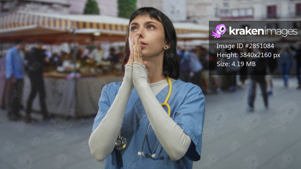 Woman wearing blue scrubs and stethoscope with hands clasped in prayer in a crowded outdoor street souvenir market; hope.