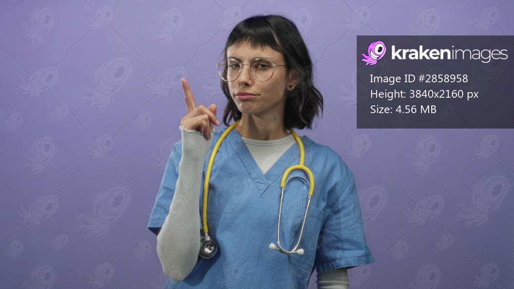Woman wearing blue scrubs with yellow stethoscope pointing index finger toward camera in purple studio; confidence.