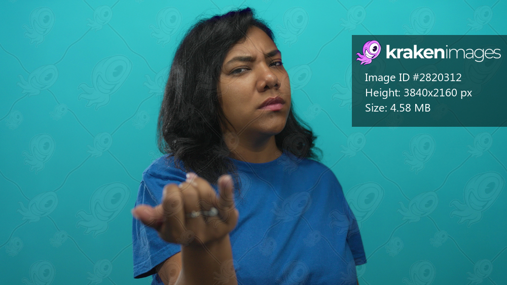 Woman wearing blue shirt with furrowed brow points finger to camera with direct gaze in studio; anger accusation.