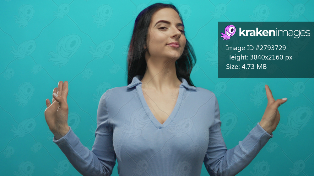 Woman wearing blue shirt poses happily against a vibrant blue wall, showcasing a lively and youthful expression.