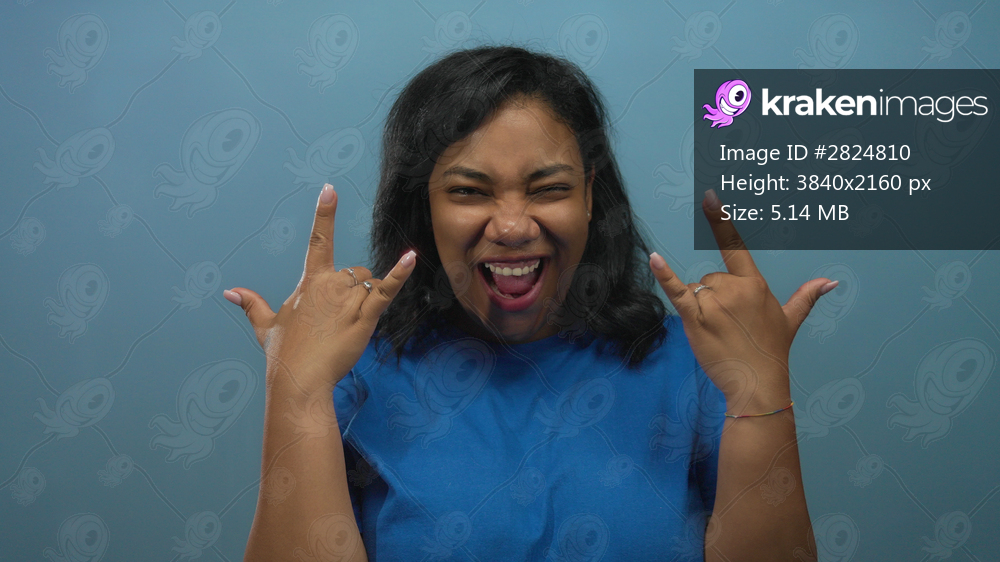 Woman wearing blue shirt showing rock horns gesture with open mouth grin in blue studio; fun energy.