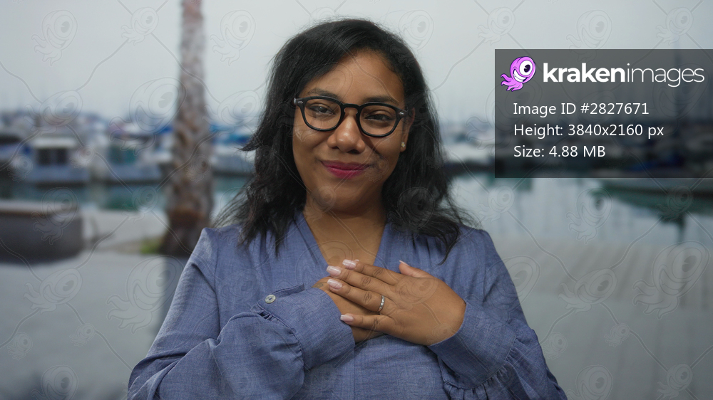 Woman wearing blue shirt smiles while holding hand on chest at a busy marina dock lined with boats; gratitude sincerity warmth appreciation.