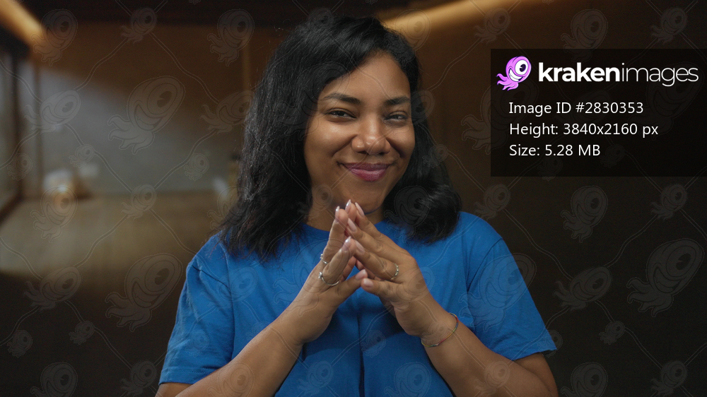 Woman wearing blue shirt smiling steeples fingers in spacious studio; serene calm confidence thoughtfulness.