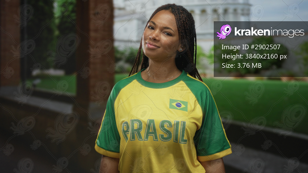Woman wearing brazil jersey with flag patch smiling with braided hair and relaxed posture beside the leaning tower at a building piazza outdoors; national pride. - Kraken Images