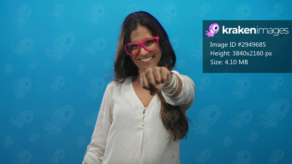 Woman wearing bright pink glasses extends fist toward camera in blue studio; confidence empowerment strength.
