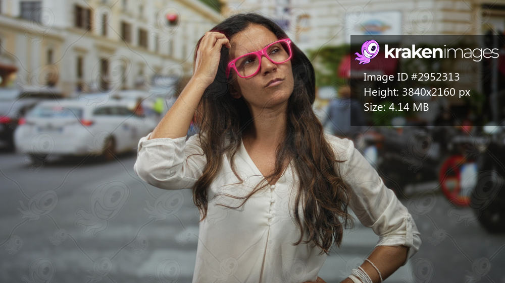 Woman wearing bright pink glasses touches hair and scratches head with hand on a city street sidewalk; thoughtful doubt.