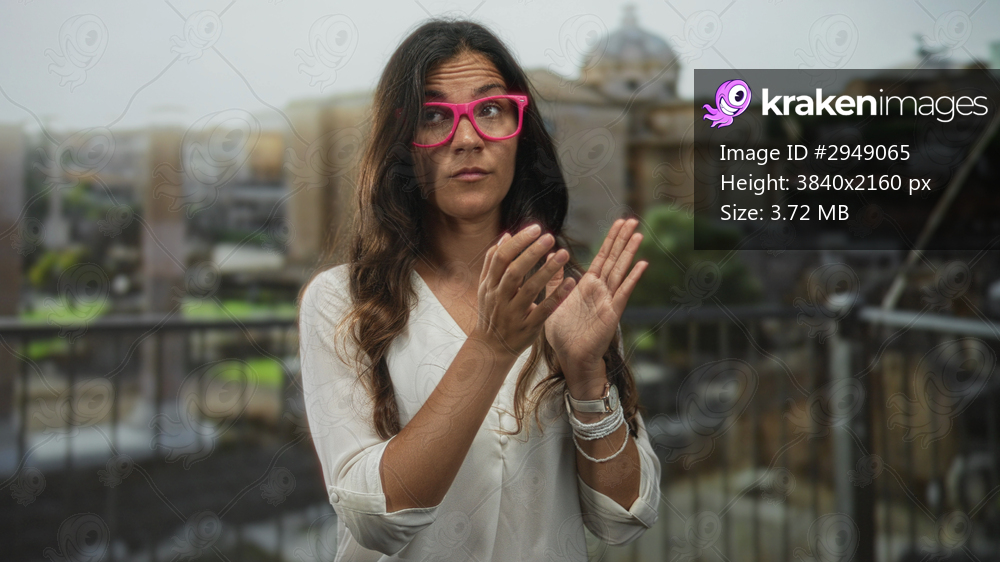 Woman wearing bright pink glasses and white blouse clasping hands and gazing upward by roman ruins on a stone building terrace; quiet contemplation.