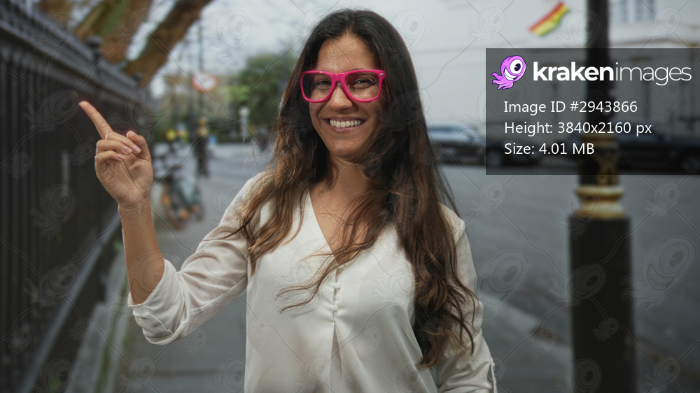 Woman wearing bright pink glasses and white blouse points finger to her left while smiling on an urban street; happiness.