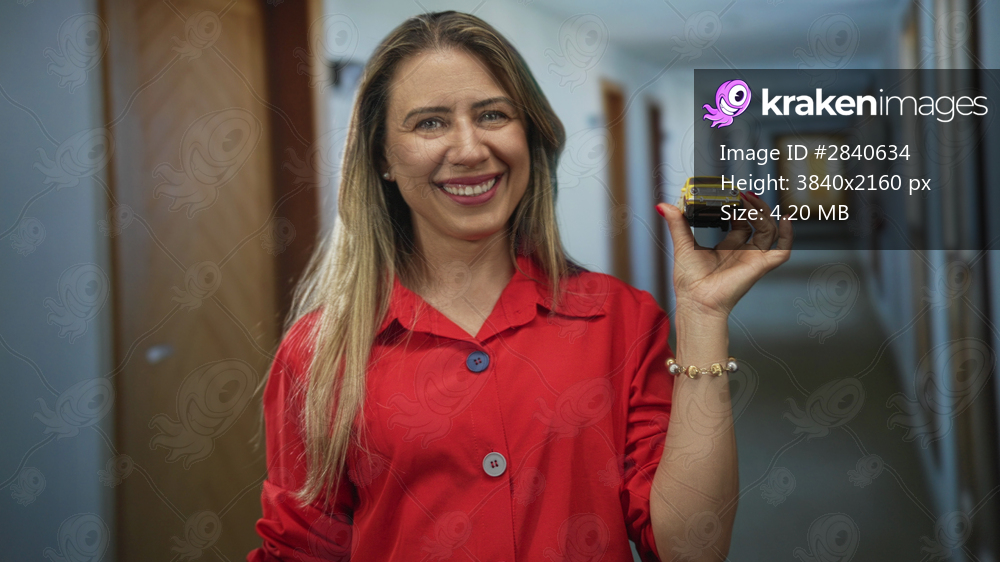 Woman wearing bright red shirt holding a small yellow toy car with both hands in hotel building; nostalgia.