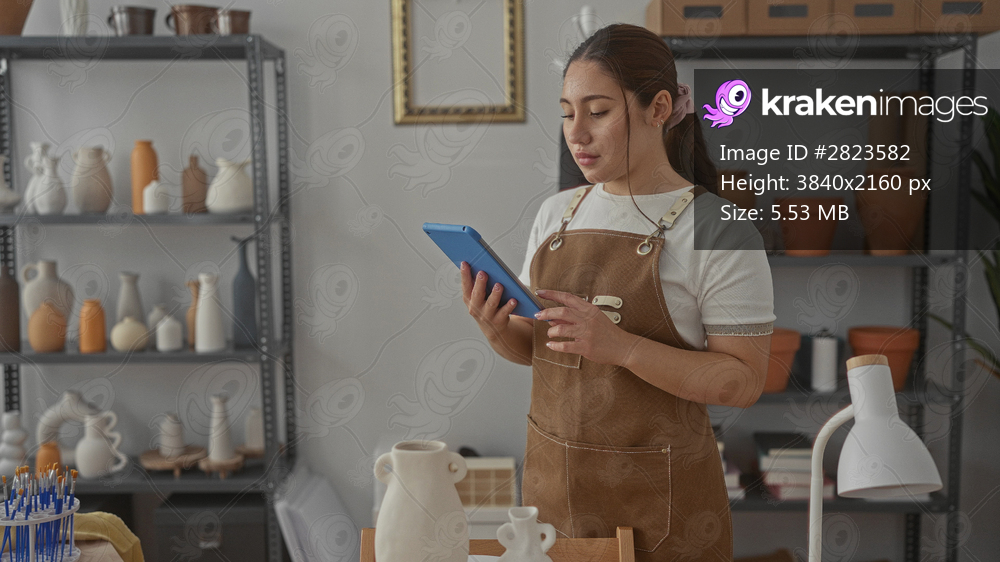 Woman wearing brown apron holds tablet and touches ceramic vase on wooden table in bright studio; craftsmanship passion.
