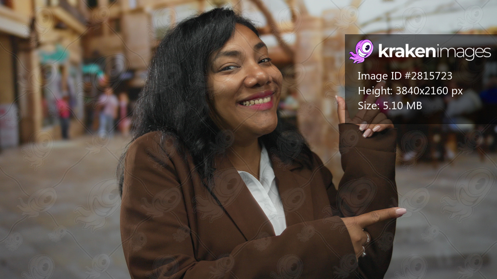Woman wearing brown blazer and white shirt points finger to object on busy city street near outdoor cafe; invitation guidance.