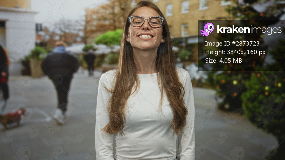 Woman wearing brown framed glasses puckers lips and makes a fish face while standing on a street near a decorated christmas tree; playful curiosity holiday cheer. - Kraken Images