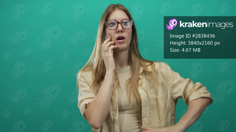 Woman wearing brown glasses and beige shirt holds smartphone to ear and rests hand on hip in green studio; surprise.