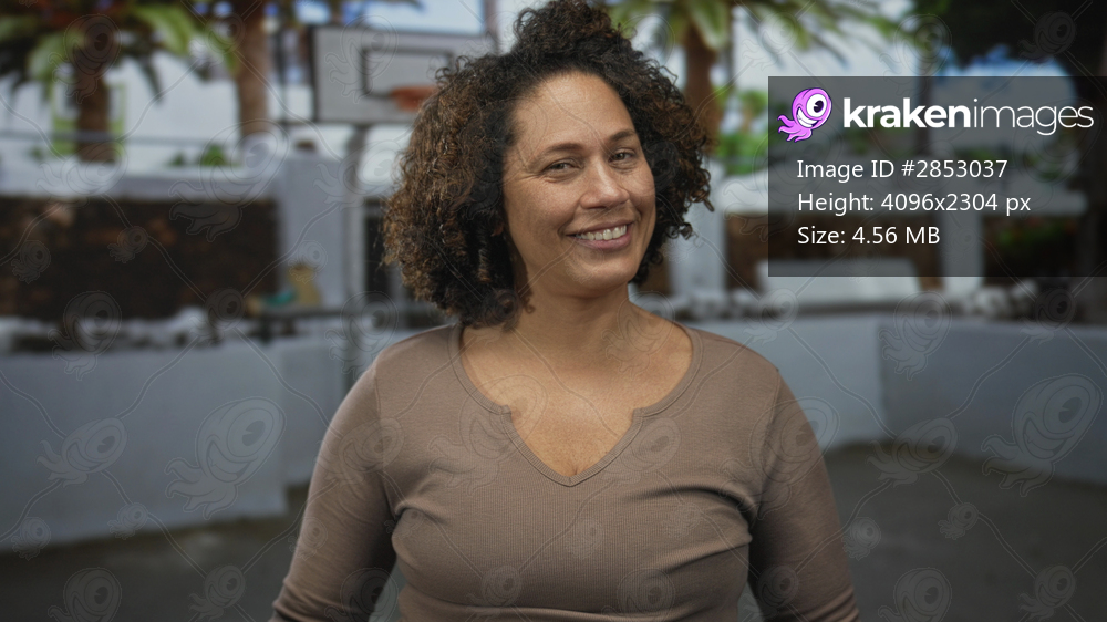 Woman wearing brown top smiles gently with closed eyes on sunlit outdoor basketball court; serenity.