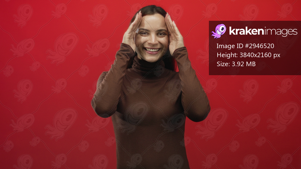 Woman wearing brown turtleneck covering face with both hands, palms pressed to eyes and furrowed brow in red studio; anxiety reflection.