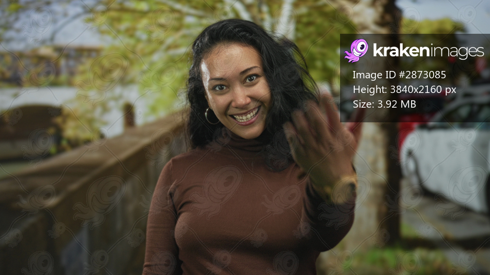 Woman wearing brown turtleneck points finger to camera on street beside parked cars and autumn trees, smiling and reaching forward; friendly joy.