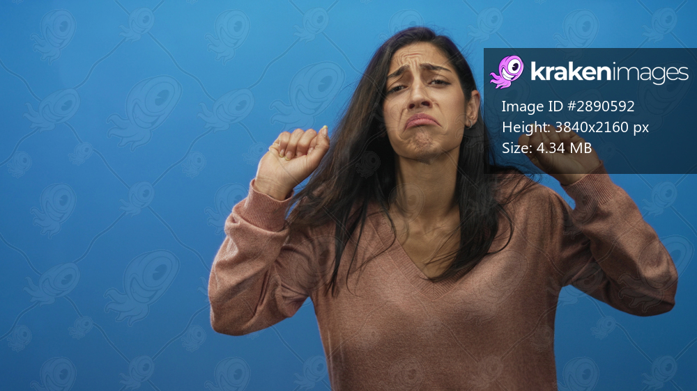 Woman wearing brown vneck sweater making a grimacing tongue out face with clenched fists and closed eyes in blue studio; disgust.