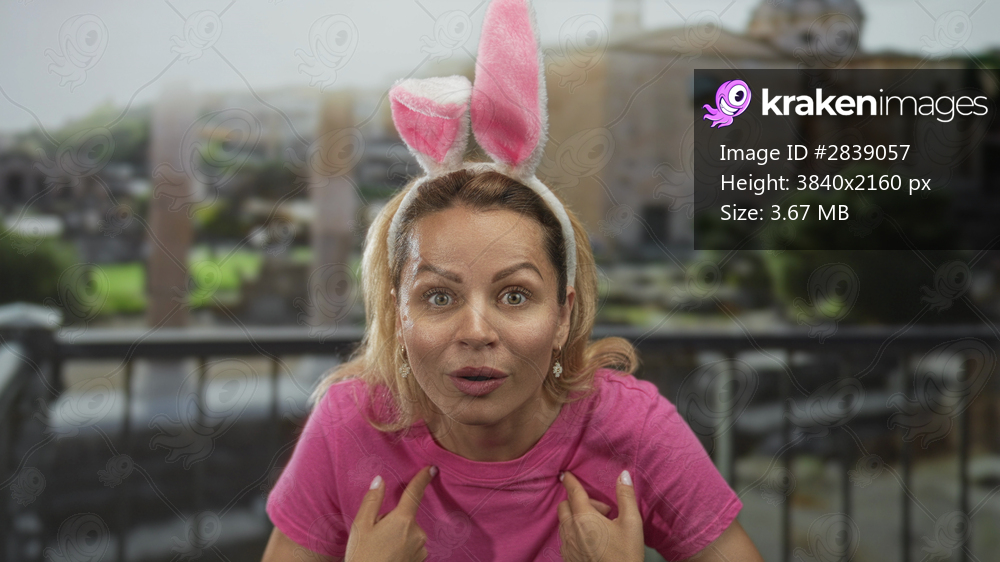Woman wearing bunny ears and a pink shirt pointing finger to chest outdoors in front of a building; surprise.