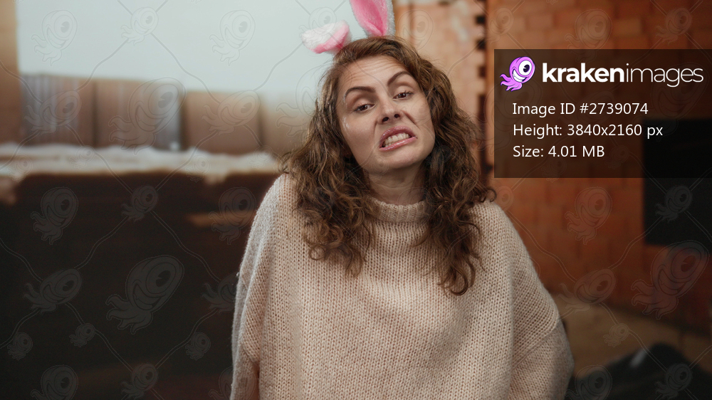 Woman wearing bunny ears at an indoor construction site with bricks and pipes in the background exuding a playful and candid expression.