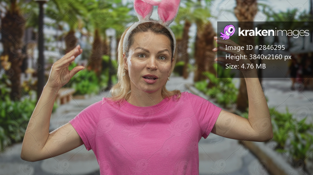 Woman wearing bunny ears gestures with hands on a sunlit green street lined with palm trees; communication.