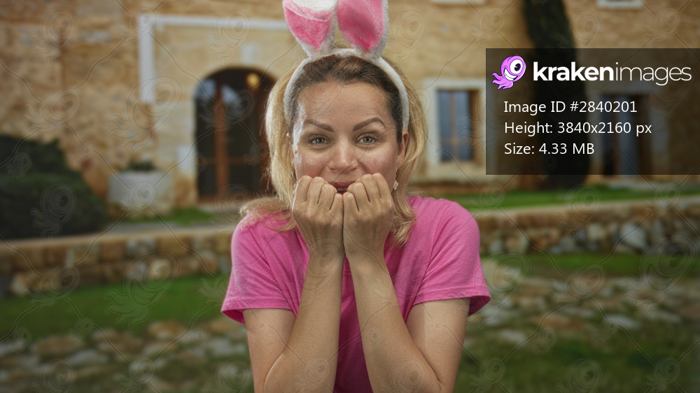Woman wearing bunny ears headband covering her face with hands at building entrance under daylight; playfulness.