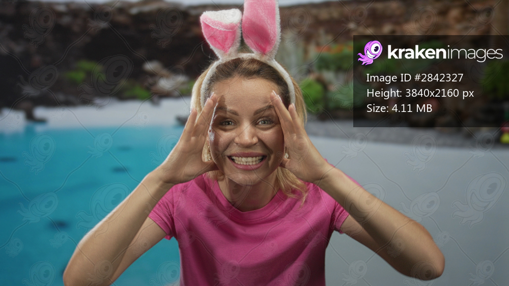 Woman wearing bunny ears headband holding head with hands in front of pool by building at resort outdoors; holiday excitement.