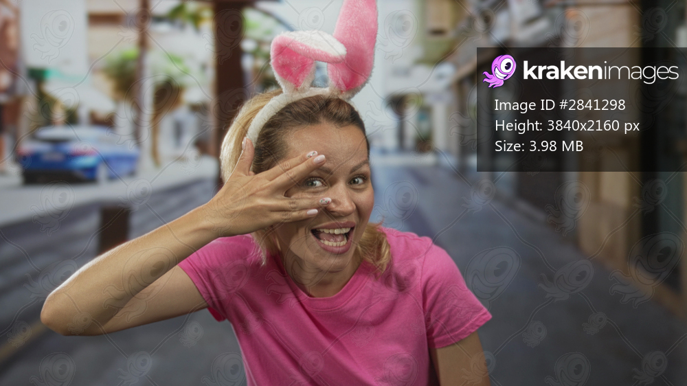 Woman wearing bunny ears headband and pink shirt covering eyes with hand on sunny city street; surprise.