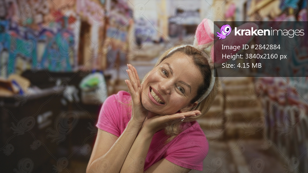 Woman wearing bunny ears headband and pink shirt frames face with hands on colorful graffiti street; playful joy.