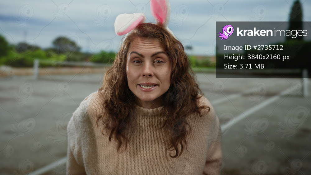 Woman wearing bunny ears making funny faces outdoors on a deserted tennis court, embodying playful and carefree expressions in a casual winter sweater against a natural background. - Kraken Images