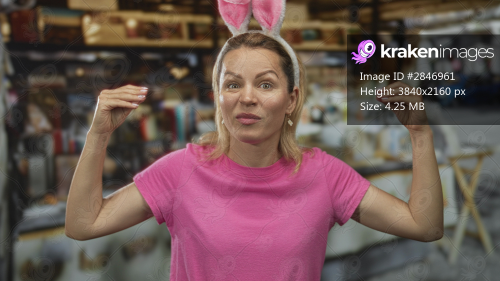 Woman wearing bunny ears and pink shirt gesturing with hands among souvenir stalls at street market; communication frustration.