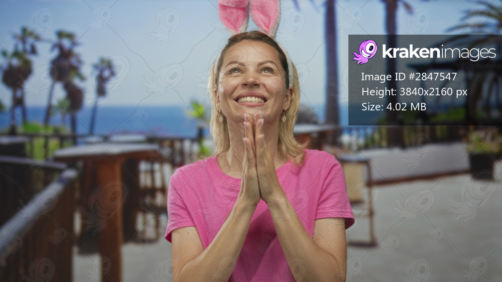 Woman wearing bunny ears and pink tee claps hands with eyes closed and pumps fists on a balcony of a building; pure joy.
