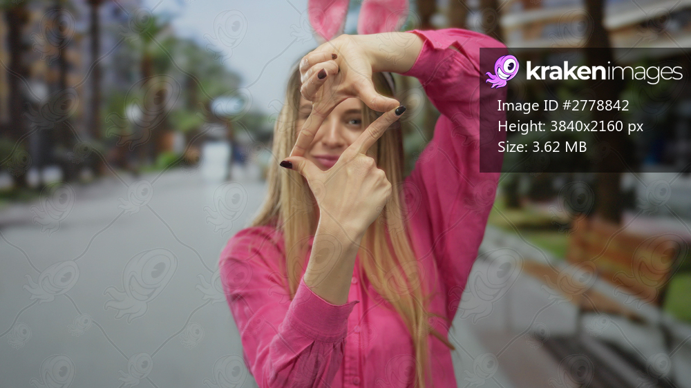 Woman wearing bunny ears playfully making a frame with her hands on a vibrant city street capturing a lively and youthful outdoor easter vibe.