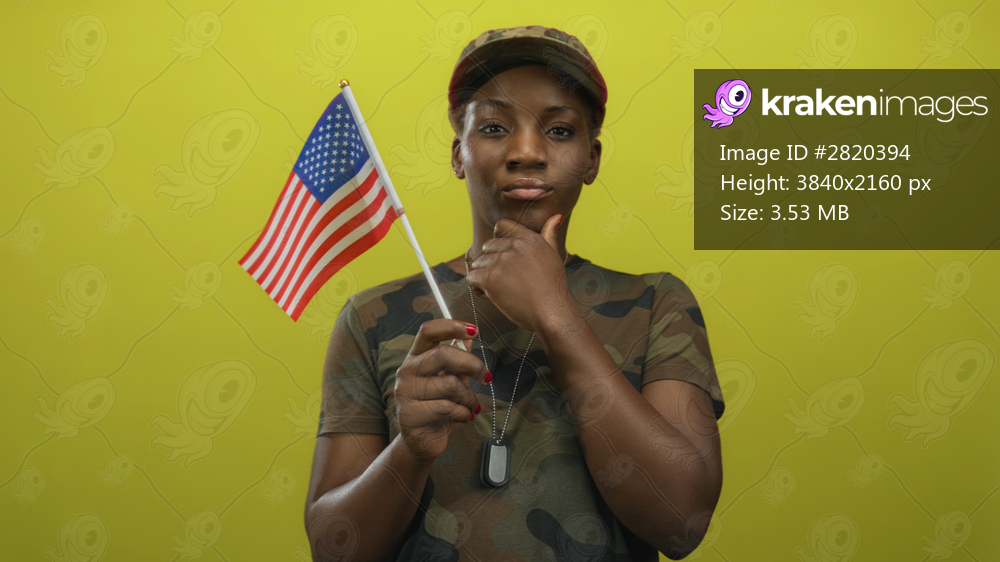 Woman wearing camouflage cap and shirt holds american flag and dog tags in studio with thoughtful expression; pride duty.