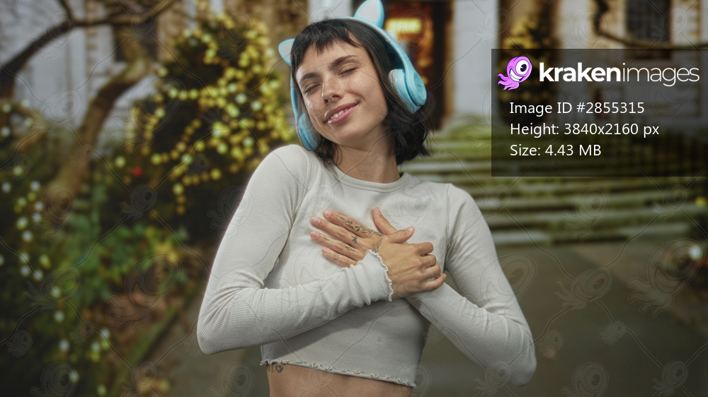 Woman wearing cat ear headphones stretches arms and tilts head back on street with stone building behind her; serenity.