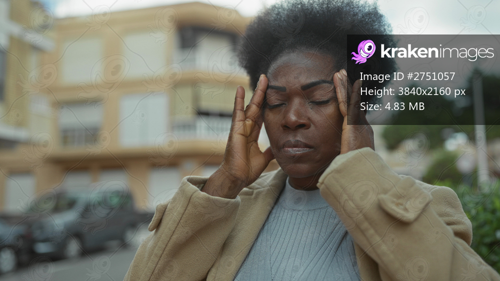 Woman wearing coat stands on urban street outdoors touching her temples with city buildings in the background looking stressed thoughtful and focused in the city environment. - Kraken Images